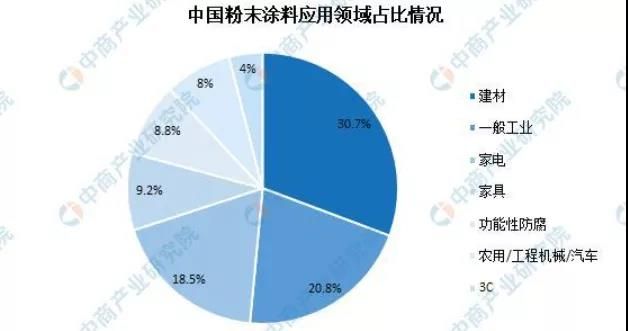 目前,我國粉末涂料已從同質(zhì)化走向了差異化,不同應(yīng)用領(lǐng)域?qū)Ψ勰┩苛系募夹g(shù)要求差異較大,因此粉末涂料企業(yè)針對不同領(lǐng)域,調(diào)整產(chǎn)品結(jié)構(gòu),出現(xiàn)了各種專業(yè)生產(chǎn)粉末涂料的企業(yè)。數(shù)據(jù)顯示,2019年,我國粉末涂料最大的應(yīng)用市場為建材領(lǐng)域,占粉末涂料總需求的30.7%;其次是一般工業(yè)市場,占粉末涂料總需求的20.8%;緊隨其后的是家電市場,占比為18.5%。
